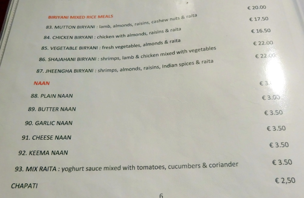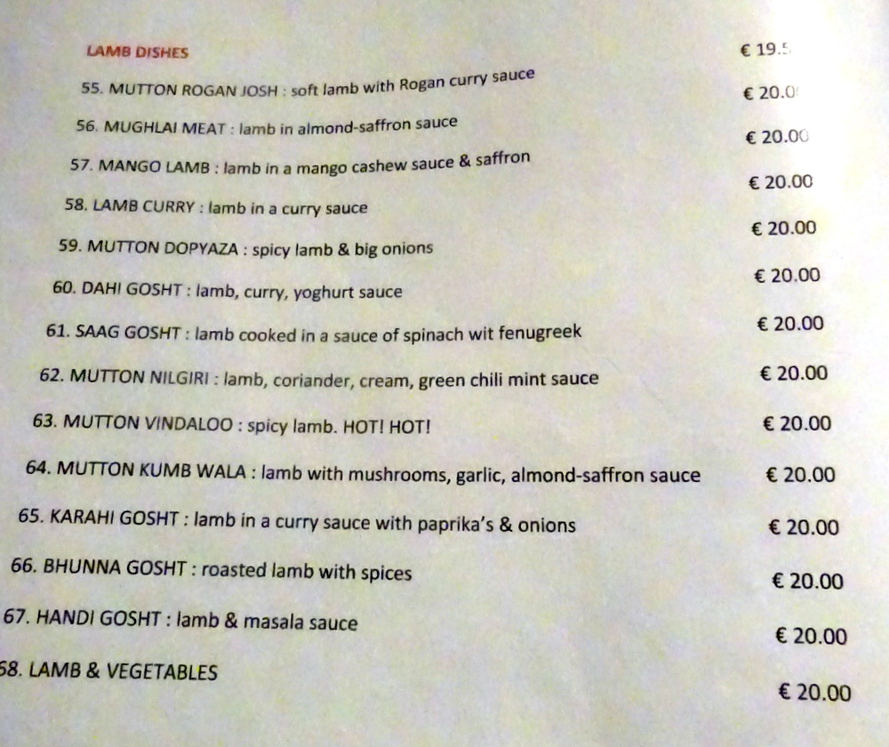 The Menu was fairly standard. All meals contain nuts – was a prominent caveat, this I liked, no messing. I considered the Fish Dishes, the Fish Curry (€20.00) was nearly my choice, however, the last of the Lamb Dishes had me won: Lamb & Vegetables (€20.00). Pricey, but this did include Rice as is the European norm.