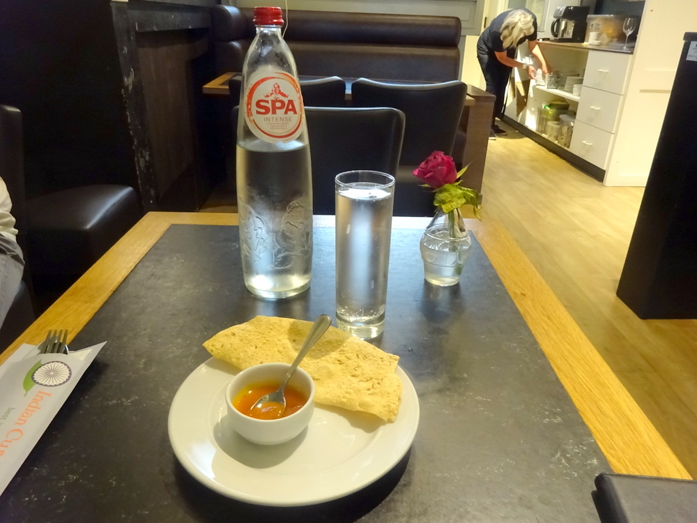 A Poppadom accompanied by a Mango Sauce was brought, a well timed distraction, my focus was turned away from my neighbours. The chap who was clearly Mein Host was busy dealing with the large group. I was amused to hear him converse with my Waitress in – English – the universal language of – Curry.