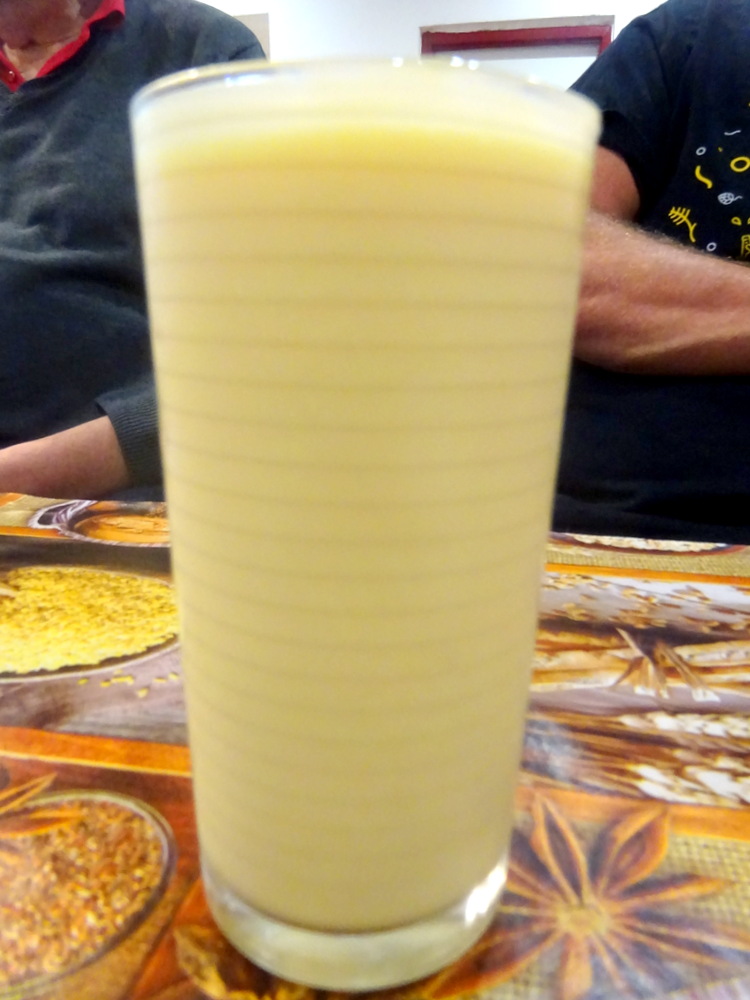 We would each order two dishes with Rice. For Hector it had to be a revisit to the Curry which so impressed back in April – Beef Karahi (€5.40). Fish Curry (€4.50) would accompany. Dr. Stan and Steve both followed the Veg and non-Veg model respectively: Lamb Saag (€5.40) plus a Mushroom Mutter (€3.50), Lamb Rogan Josh (€5.40) plus Paneer Masala (€3.90). A Sparkling Water (€1.30) and two glasses of Mango Lassi (€1.00) completed the Order.