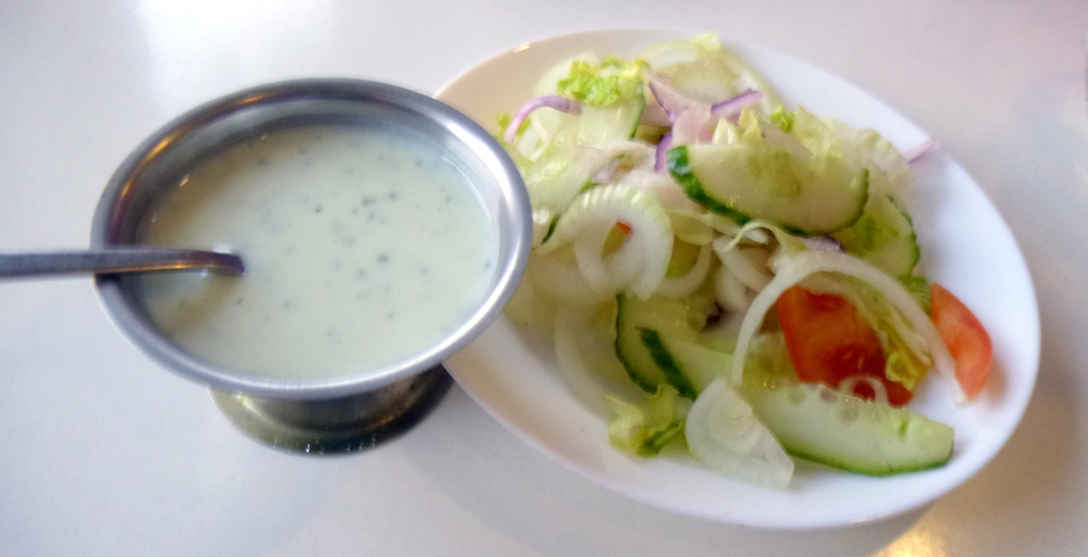 The Lady on duty brought a jug of Water followed by a Salad and Raita. She then opened the door to empty the bins, cue a blast of cold air. Four Polish chaps took the table under the TV. It was good to see that our European cousins have found Karahi Palace, what is wrong with the rest of Glasgow’s Curry enthusiasts?