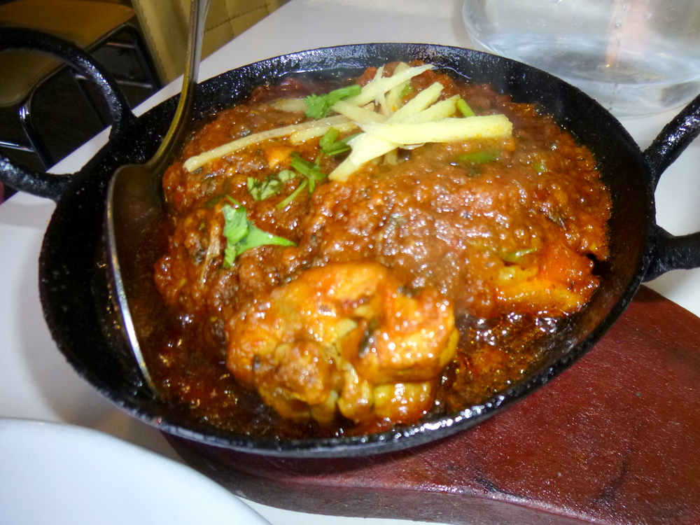The substantial Chapatti was accompanied by a Chilli and Coriander Naan which had been halved, why? The perforations on the Naan put this some way towards the Rogni style. Someone may explain why Chefs tend to do this when I ask for Chilli and Coriander. The contents of both karahi were visibly – Hot. This is a major plus for food at Karahi Palace, it comes right away, no waiting for – Service!