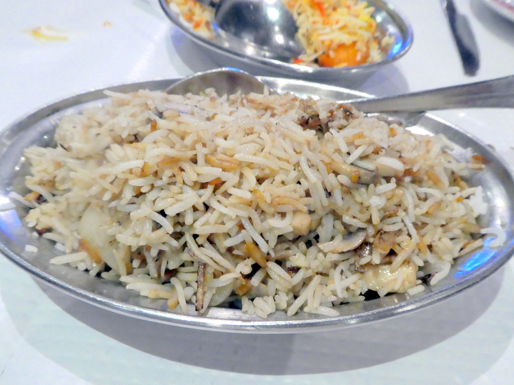 The Mushroom Rice had Onions present also. The Rice had been lightly spiced, tasty. When I see Mushrooms with this texture I always think – tinned. Possibly they were. The Pulaw had Peas, Green Beans and Carrots mixed through, a mini Biryani, so worth the extra. Had I known, I would have ordered Pulaw also.