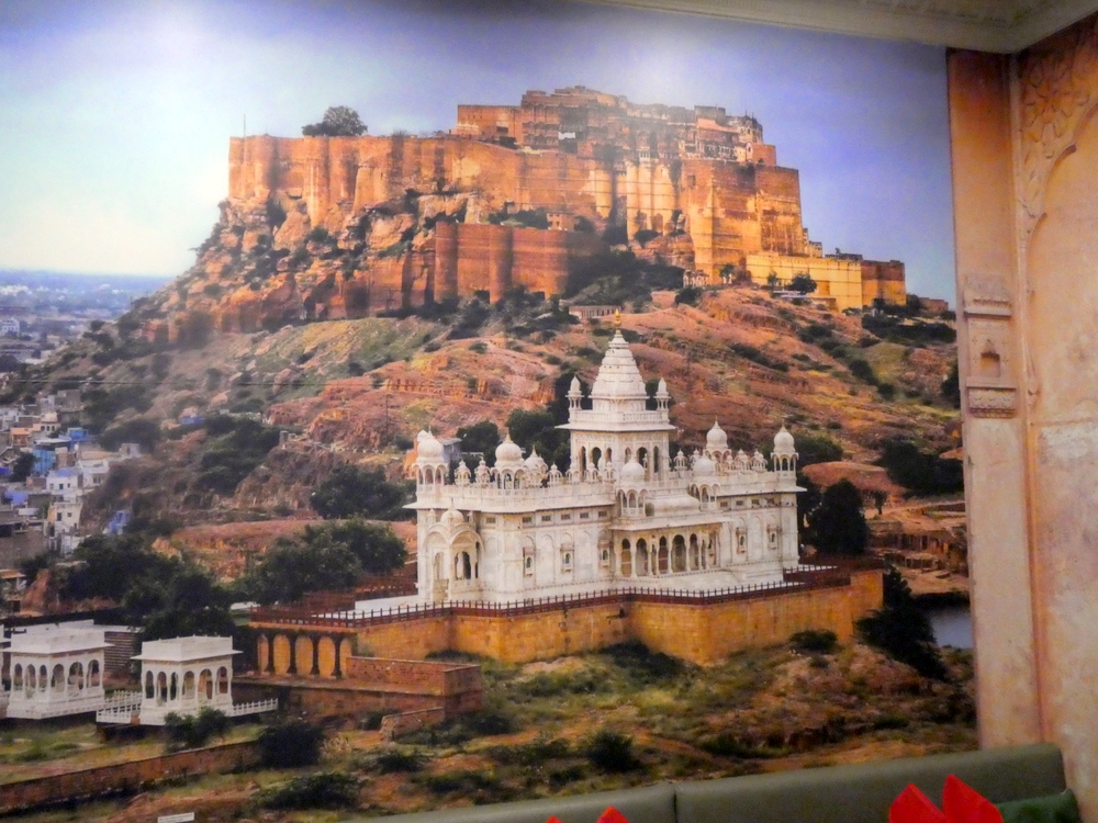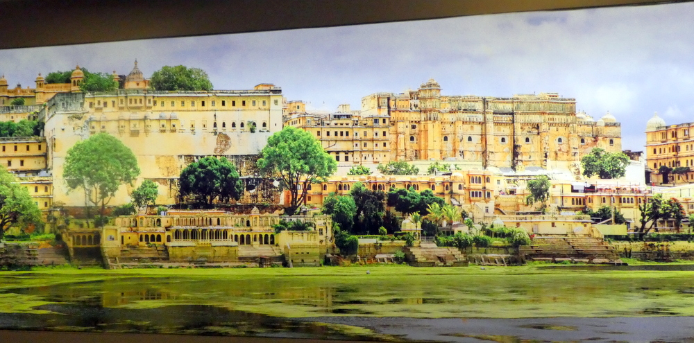 There was time to take the camera on a tour of the premises. Two very impressive muriels (sic) impressed, – Rajahstan – was as close as our waiter would identify the huge fortification above the lake. The palaces at the foot, and on top of the mesa, impressed also.