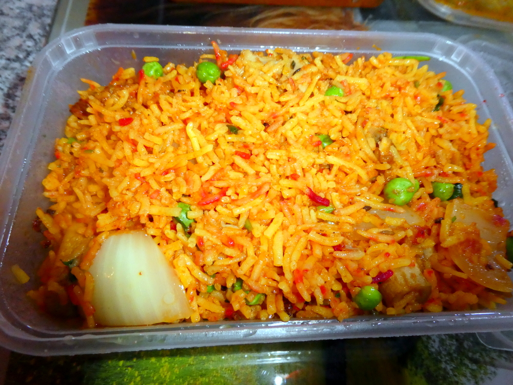 No Pakora for Hector tonight, instead potions of Rice and Curry that could count as – double – in many a Restaurant. I spread out the Rice, no way would I eat all this at one sitting, tomorrow is another day. Large pieces of Onion, Peas and Mushrooms were the added Vegetables.
