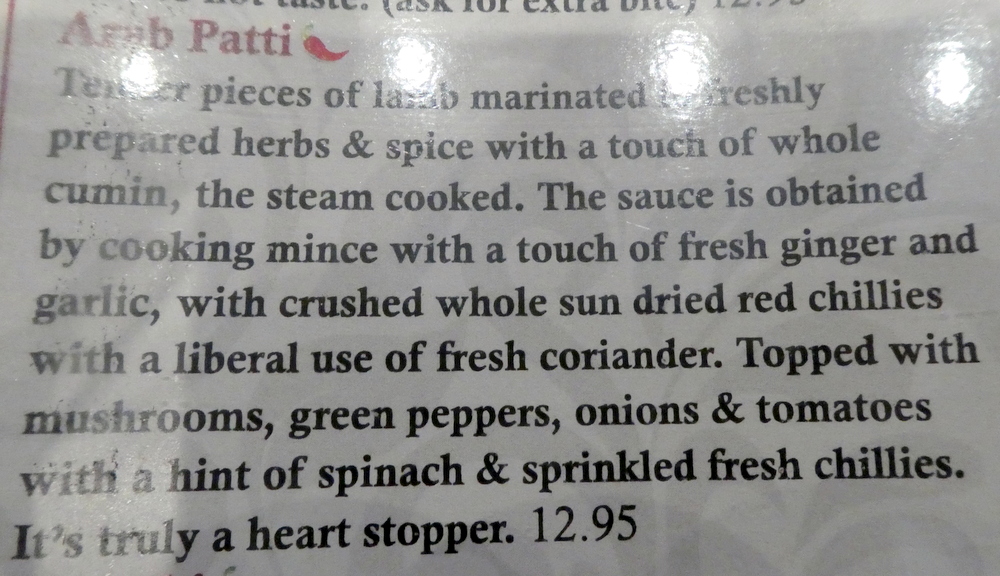Arab Patti in the – Connoisseur Selection looked very interesting, my usual tweak permitted. The waiter thought the flavours here would be less intense than the Desi Dishes, so it was back to my original plan: Lamb Chop Masala (£11.95). I felt like a Vegetable accompaniment but could only see Main Courses, again the waiter came to my assistance.
