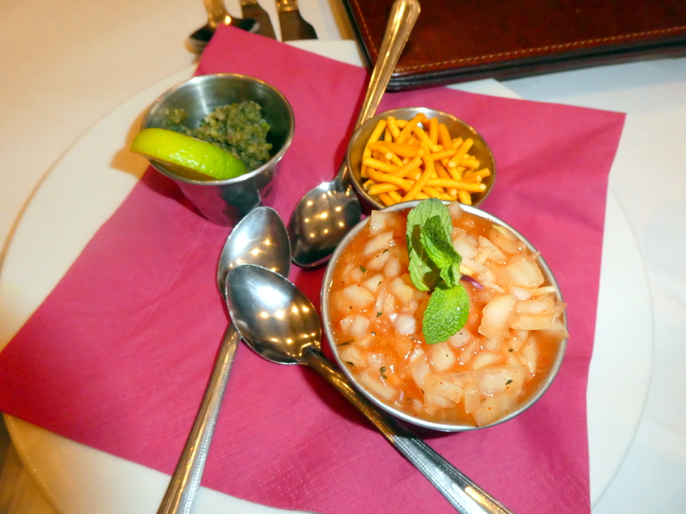 Two plates of Poppadoms were presented along with two rounds of Spiced Onion, Bombay Mix and a Mint-Lime Mash. Danny’s famed Pickle was also set in the middle of the table. He asked if I had had this previously. As it happens it was served at the Grand Opening. Tasty as it was, it did not kill the palate as some Lime Pickle can.