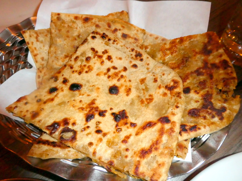The best way to avoid the dreaded Green Mush, was to choose from the – Vegetarian Dishes. These were available at £7.95 for a Main Dish and £6.95 for a Side Dish. Why order a – Side? I was also trusting that Capsicum, needlessly used in the Meat Dishes would not appear in the Vegetarian Dishes. Aloo Gobi and Daal Makhani therefore became my choices, with a Keema Paratha (£3.50) to accompany.