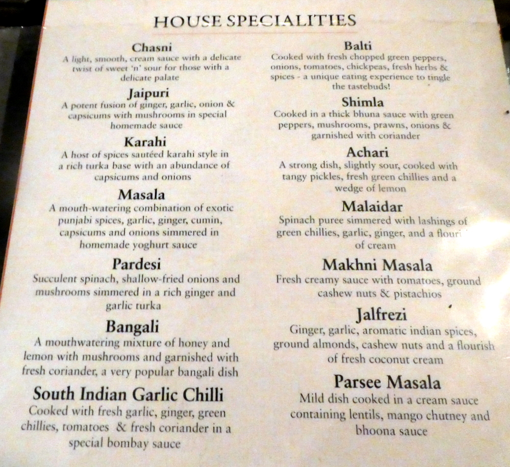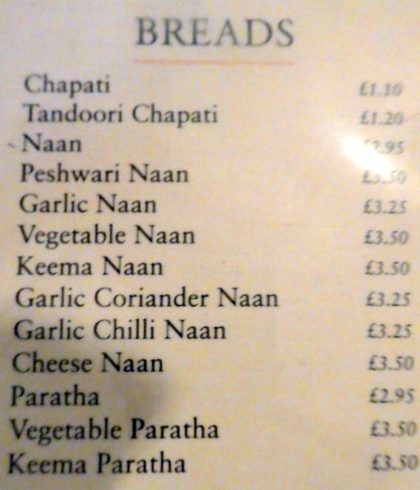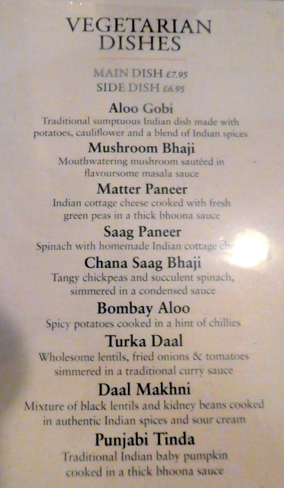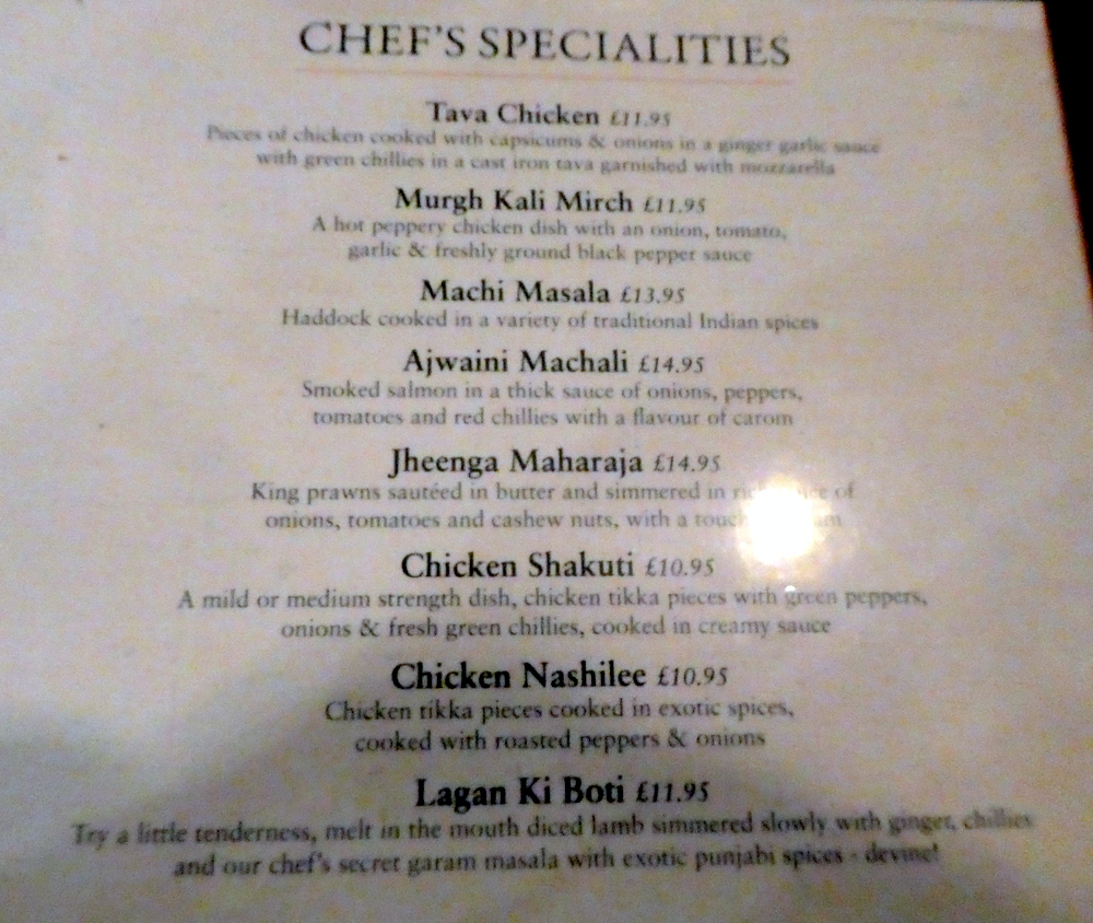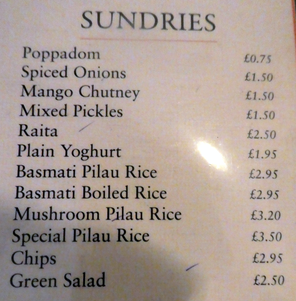 At the top of the stairs two chaps were deep in discussion, one I would later establish was the delivery driver, he had a quiet night. Only three tables were occupied in the somewhat large premises, interesting. On the train journey down I had studied the Menu. Prices have certainly gone up more than the rate of inflation since I was last here three years ago. Last time I found the Menu to be almost the antithesis of what I seek in Curry, a predominance of Chicken Dishes and Green Peppers otherwise mentioned in the description of too many.
