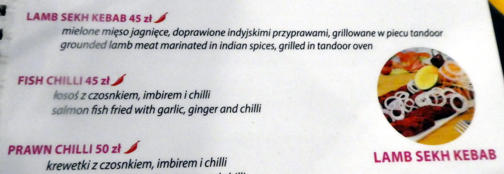 I showed the photo of Capsicum on – The Curry-Heute Campaign – page and confirmed with the waiter than none would come in my direction. He assured me that there would be none in the Methi Lamb. I was then advised that as the Methi Lamb came with Rice, I would not need the Biryani, a Starter was suggested. Flicking back quickly to the front of the Menu, I spotted Lamb Seekh Kebab (45zl).