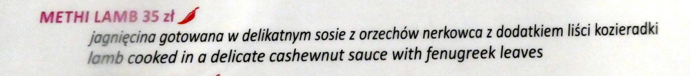 Finding Methi Lamb (35zl) was an unexpected bonus, surely worth a try despite the mention of a – delicate cashewnut Sauce. Following on from last night’s partial success with the Lamb Hyderabi Biryani at Icy & Spicy (Katowice), I considered Veg Hyderabadi Biryani (28zl) to be a worthwhile accompaniment. Both Dishes were quoted as being 400g.
