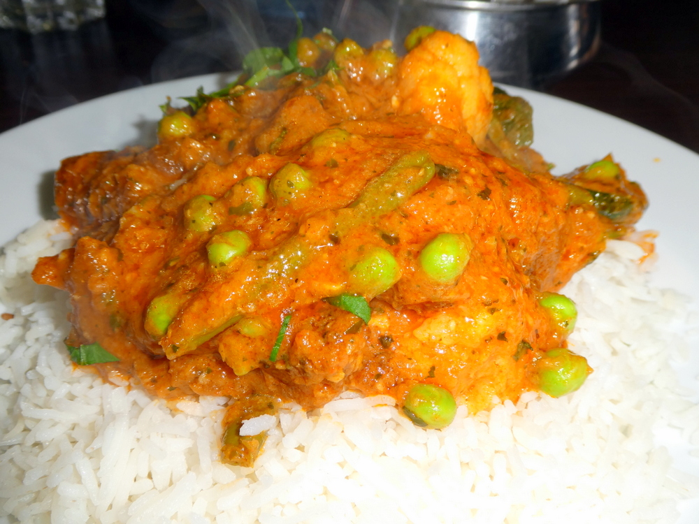 Swera set the standard yesterday. In terms of appearance today’s Sabzi matched it. The Curry was topped with Ginger Strips and a sprinkling of Coriander leaves. As I decanted the contents of the pot, so I noted the Vegetables: Green Beans, Peas, Cauliflower, Courgette and Carrots. There were plenty of pieces of Fish in there also, Rotbarschfillet which translates as Redfish. Now we know, I trust a Fish expert will remind me what this actually was. The Masala, once revealed, looked on the thin side, the quantity was such this Dish was thankfully far from – Soup.