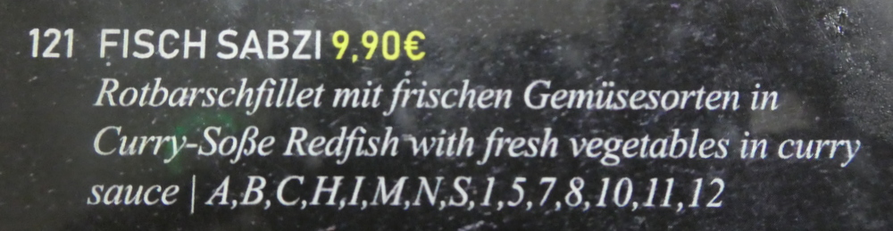 I was pleased to see a – Fisch – section, time for a change from Lamb. Fisch Sabzi (€9.90) could satisfy my desire to include – Interesting Vegetables. The young chap serving came to take my Order. He confirmed that Rice was included making the Curry even better value, and accepted my request for – Scharf und ohne Paprika. I also added – Desi, Apna – just in case it made a difference. A chilled litre bottle of Sparkling Water (€3.00) was provided, just the job. It was 16ºC outside, there is a sign that winter may be over.