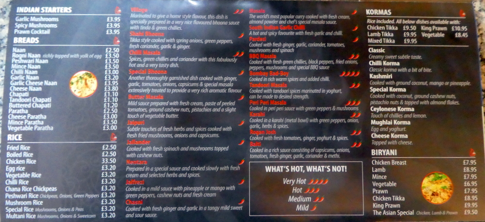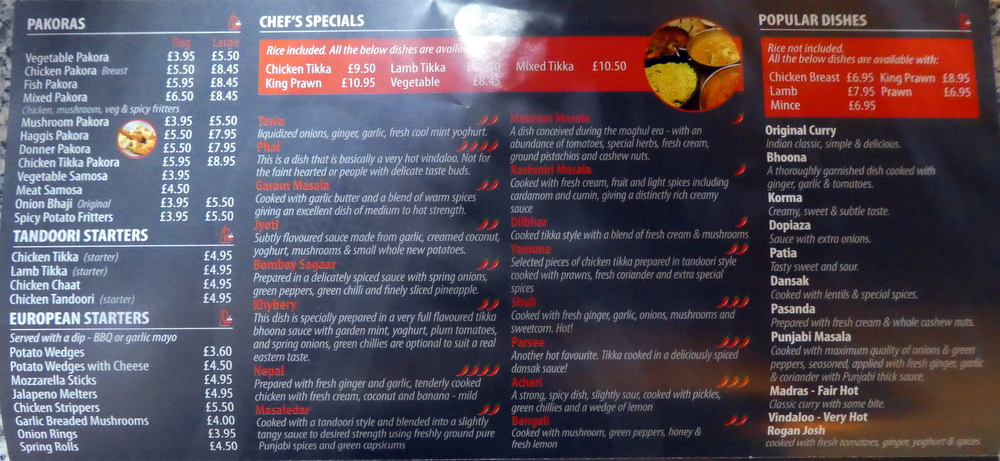 All of the Chef’s Specials feature Lamb as Tikka only (£10.95). I can never understand why this happens. For me, Lamb Tikka is too good to put in Curry and is best savoured otherwise. A Tender Lamb option in all Curry please. I could have chosen from the more limited and standard Popular Dishes list (£7.95), but was determined to establish what Chef is capable of.