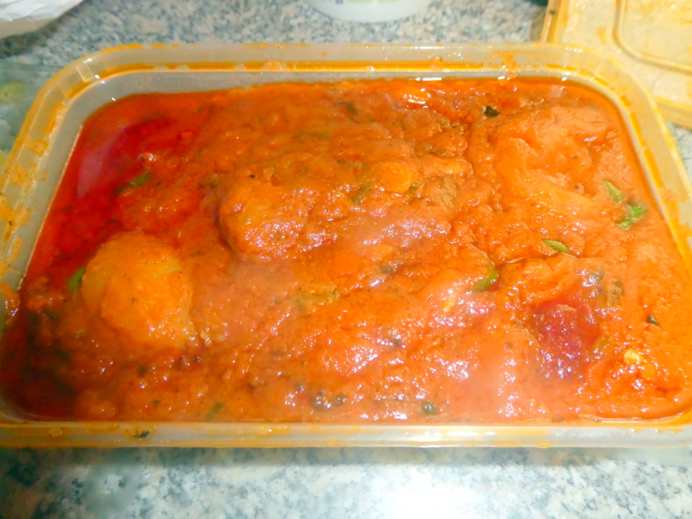 On decanting the contents of the plastic tray into the karahi, something very unusual was observed. This Curry was created from two different Masalas. The lighter, brown, I took to have Yoghurt added, even Daal. The other half was unnaturally – Red. Food colouring, yeuch! The Menu shows one can buy Curry Sauces alone. Was this the Chasni? Whatever, I was glad I was not eating it. I wonder that any Chef would have let this leave the premises, this is shooting oneself in the foot.