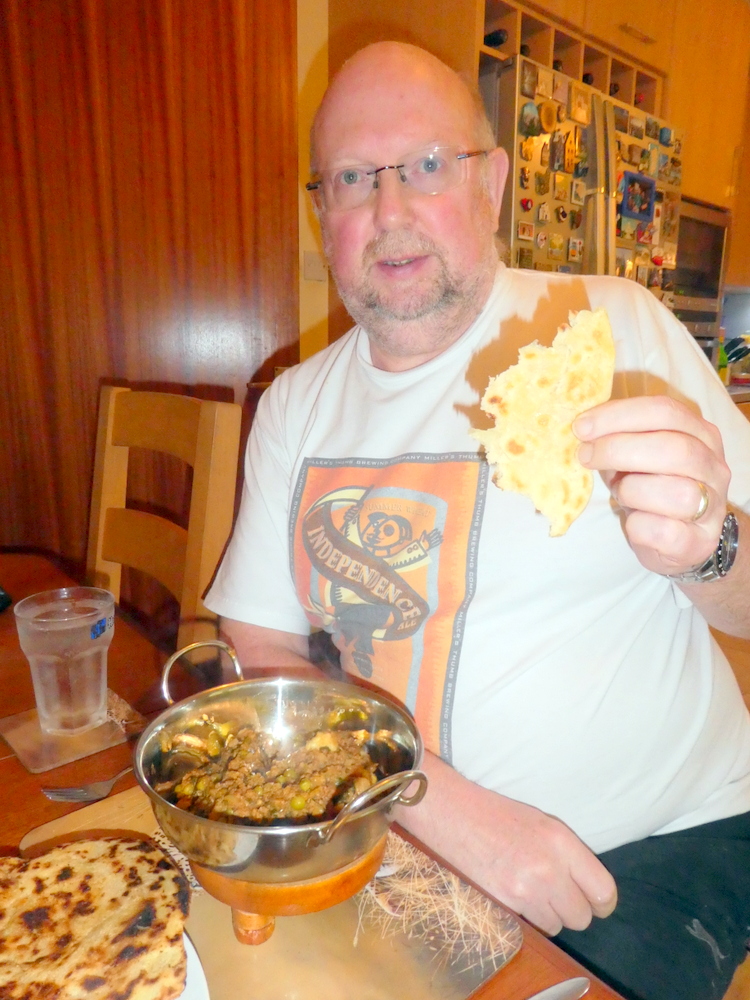 Hector’s contribution to the meal was the Bread. Somehow, more than a year has passed since the second attempt at making Paratha. The dough for today’s Paratha was White Flour and Salt only, no Eggs. Chapatti Flour, both white and wholemeal, used previously, did not create the type of Paratha sought. Three dough-balls were treated with Ghee to create the layering, one was left to cook as a Chapatti/Roti.