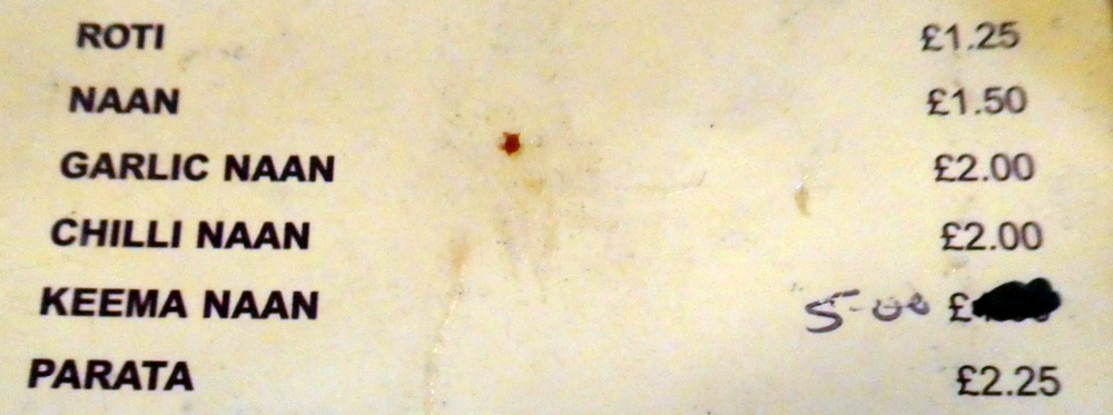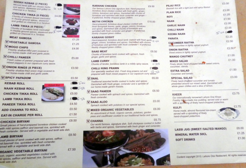 The ladies left us at the door to Lahore One and headed west towards a coffee house. Only one diner was inside when we arrived. A lady was front of house, a chap behind the counter with another spotted occasionally in the kitchen. The Menu was brought to us: