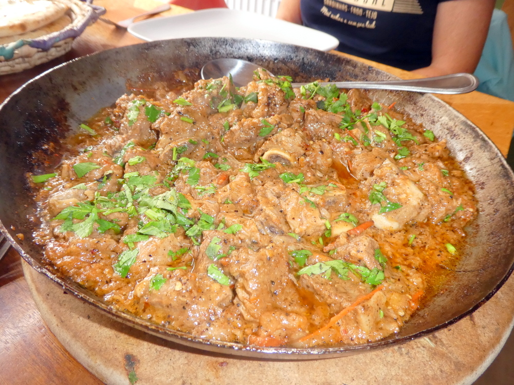 Fresh Coriander topped the Meat and Masala spread across the flat karahi. There was a mixture of Meat on-the-bone and boneless. Ribs and Sucky Bones were present. The Masala had the appearance of – something special – which Aqeel has turned out consistently throughout the summer.