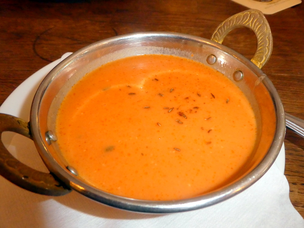 For drinks, 0.4l glasses of Fanta and Sprite were ordered. €4.40 for soft drinks, outrageous. Seconds before the drinks arrived, two small karahi were brought to the table, how could our Curry be served this quickly? It turned out to be complimentary Shorva, a nice touch. The Tomato Soup was thankfully – hot – and was well Seasoned, there was no Spice of note. Still, it woke up the taste-buds.