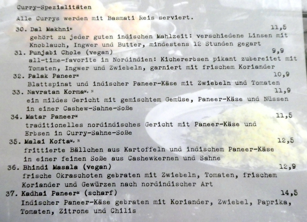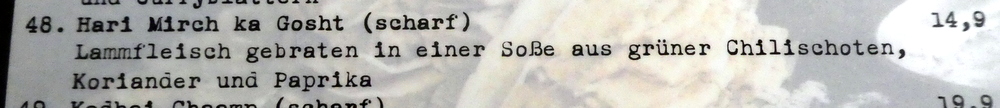 Two menus were brought the Mittagstisch and the a la carte. Clive was happy to have the Gosht Shimla (€8.50), it would bring back memories of his visit to – Shimla – in the foothills of the Himalayas. I was determined to find out what the real Dishes might offer. At the doorway, I had spotted a fine looking brown Bhuna-style Masala. Having read beyond the Chicken and Cheese Dishes, the Hari Mirch ka Gosht (€14.90) was a possibility. The – sauce – was described as being cooked in Green Chillies, Coriander and Peppers. Green Chilli Mutton – is how this Curry translates into English, the dark, rich Masala as seen at the doorway was hoped for. I established that pieces of – Paprika – would not actually be visible in the Curry, blended in, I can cope with.