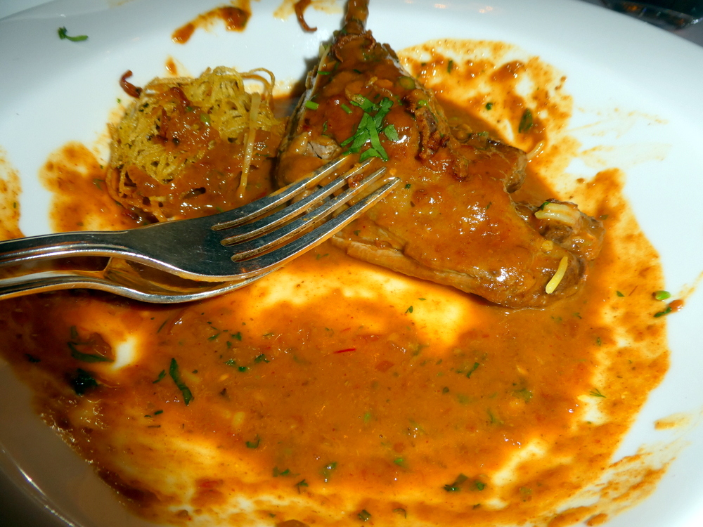 A garnish which looked like a nest of sliced Onions, a Tarka, was accompanied by a sprinkling of Herbs and Ginger. The Onions were initially set aside. Two legs of Duck, served on-the-bone, sat atop a minimal, blended Masala. This was clearly not the same Masala as served above, much thicker. The pieces of Potato had been arranged around the Meat, smothered in Masala, I must admit to being impressed by the presentation.