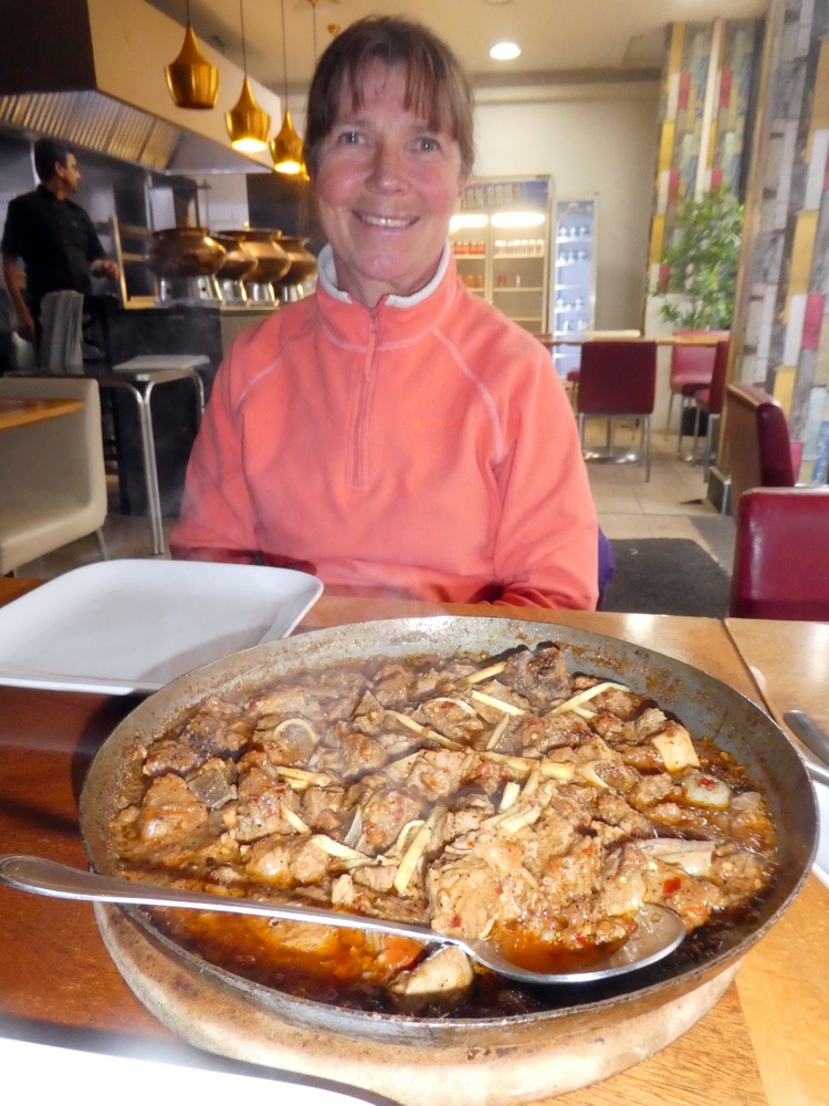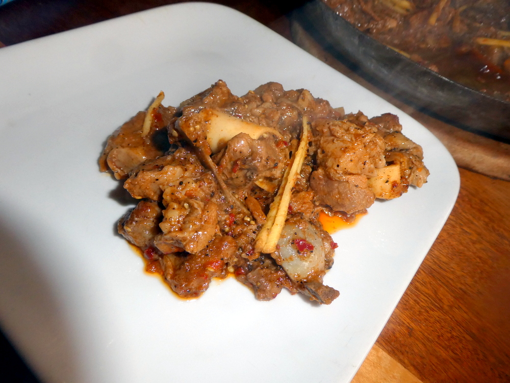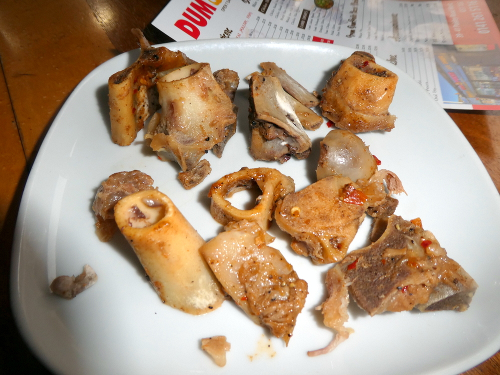 I was more adventurous with the sucky bones, even some marrow. I still prefer the small pieces of meat with the peppery sauce and the ginger strips, – and the Roti. An excellent meal.