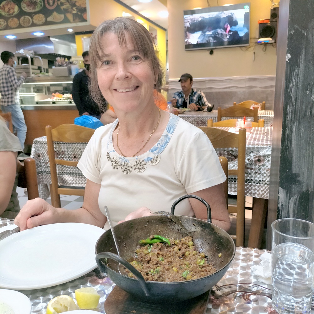 Prices have not increased here in all the years of Curry-Heute visits. Hector’s default choice at Pak Taka Tak – Karahi Gosht – at €4.00 is almost unbelievable. With three fellow diners, greater coverage of the Menu was possible today. Clive went for Beef Karahi (€4.00), somehow, in Hector’s eagerness to eat, no photo of the Beef Karahi was recorded. Maggie joined Marg with Keema Matar (€4.00) after establishing, courtesy of a fellow customer doing the translating, that Fish (1 piece) (€4.00) was not available as a Curry. The Chicken Karahi (€4.00) was finished already. To keep things simple, I ordered four Naan. Marg asked for a Roti via our translator, I don’t think they do Roti/Chapattis. Maggie announced she cannot eat Bread, Rice was added. Clive put in a bid for a Keema Naan (€1.00).