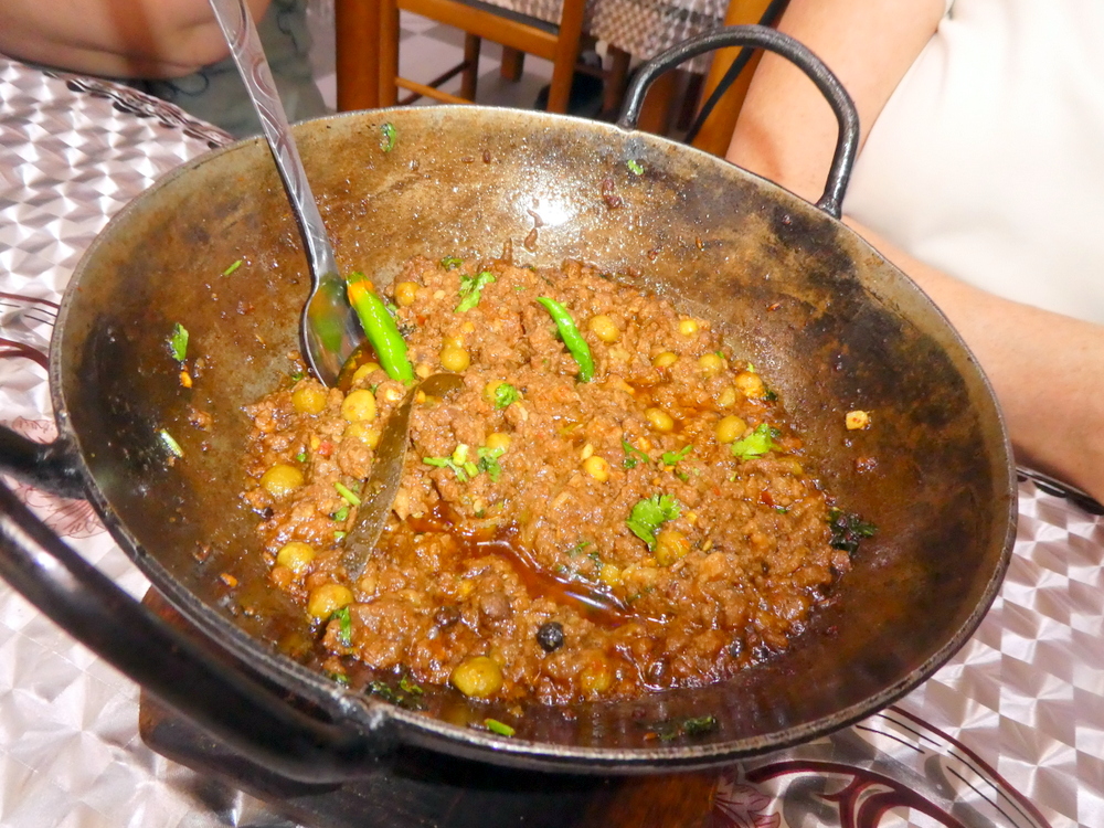 As Dry as Keema Mutter should be, and with whole Green Chillies sitting menacingly on top, this was definitely the real thing. Marg identified Coriander stalks as being mixed through the Curry. Busy with his own monstrous Curry portion, Hector refrained from the usual Soupçon, one day. Marg had devoured a Salad then took care of her Curry and may well have had a whole Naan. At the end, only her Chillies remained, one day.