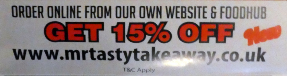 Mr Tasty (20 Fleming Avenue, Whitecrook, Clydebank G81 1AJ) is located in a small shopping parade in a residential area. On arrival this evening just after 18.00, the set up was evidently that of Chip Shop turned Curry outlet. Fish & Chips is way down the menu, Pizza and Kebab are competitively priced.
