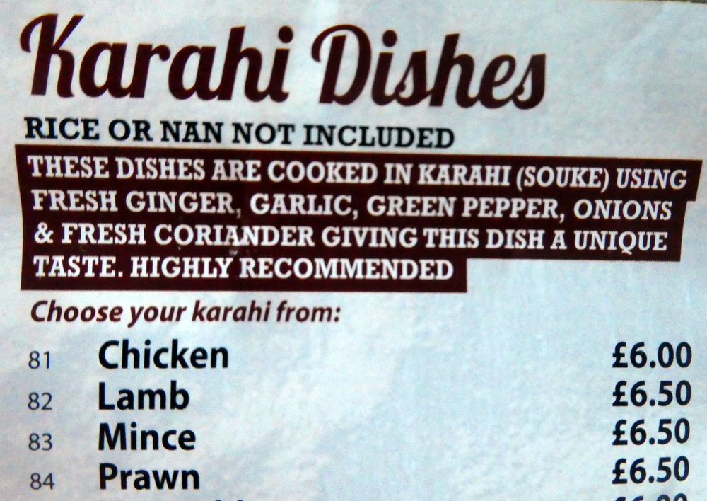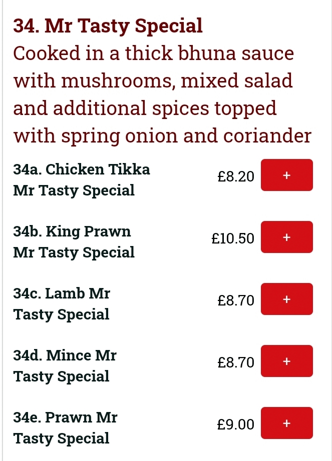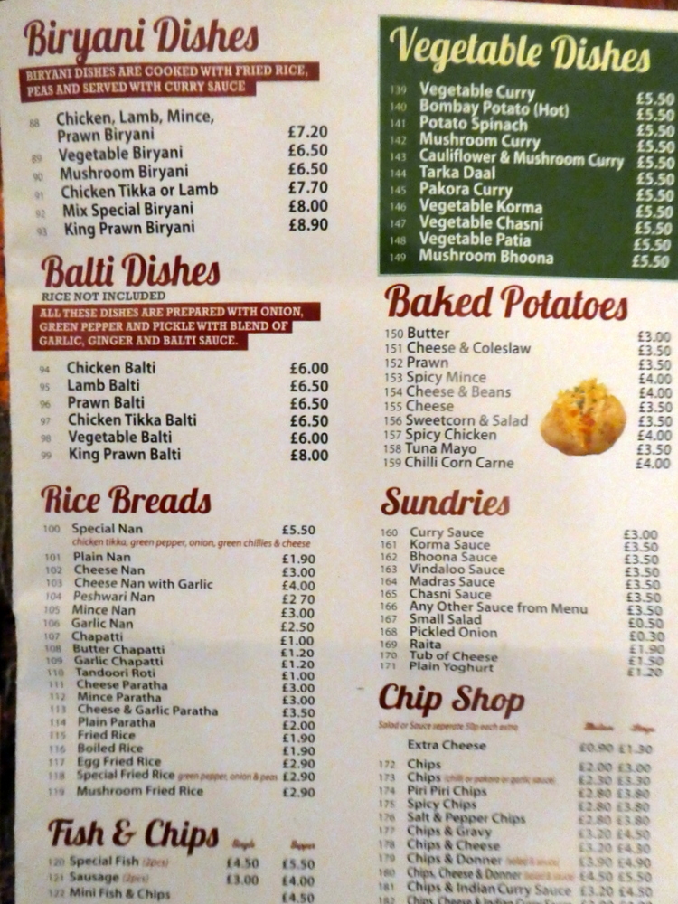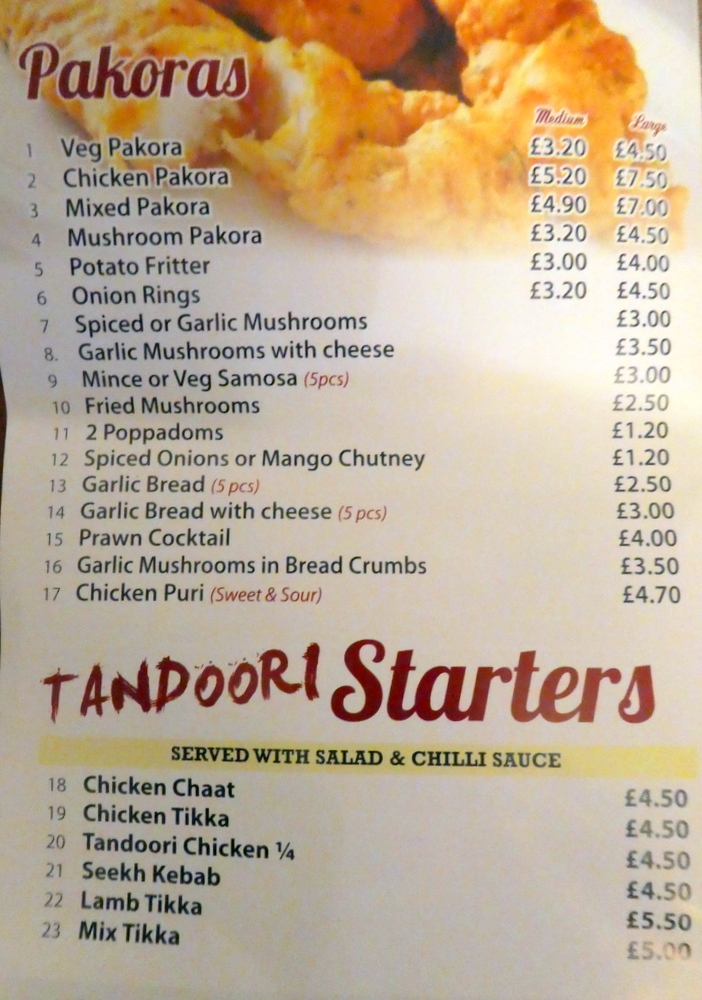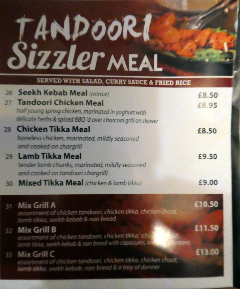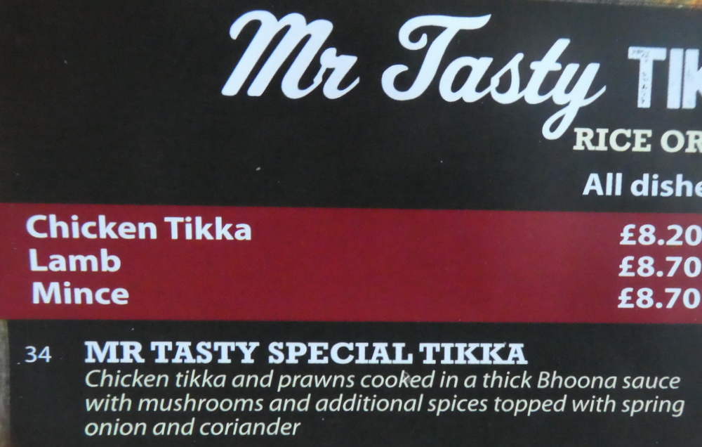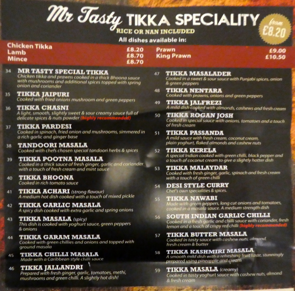 Having studied the online menu before travelling, it revealed something approaching a little shop of horrors in terms of Hector’s predilections. Capsicum must be avoided at all costs, Mr Tasty was not making this easy. The customary Karahi Gosht was a no-go area, the description for the Karahi Dishes confirmed all that must be avoided, no doubt Big Blobs of Onion too. Mr Tasty Tikka Speciality, this section confused. Chicken Tikka (£8.20) was clearly available, but how does this explain Lamb (£8.70) and Mince (£8.70). Keema as Tikka? Never heard of it.