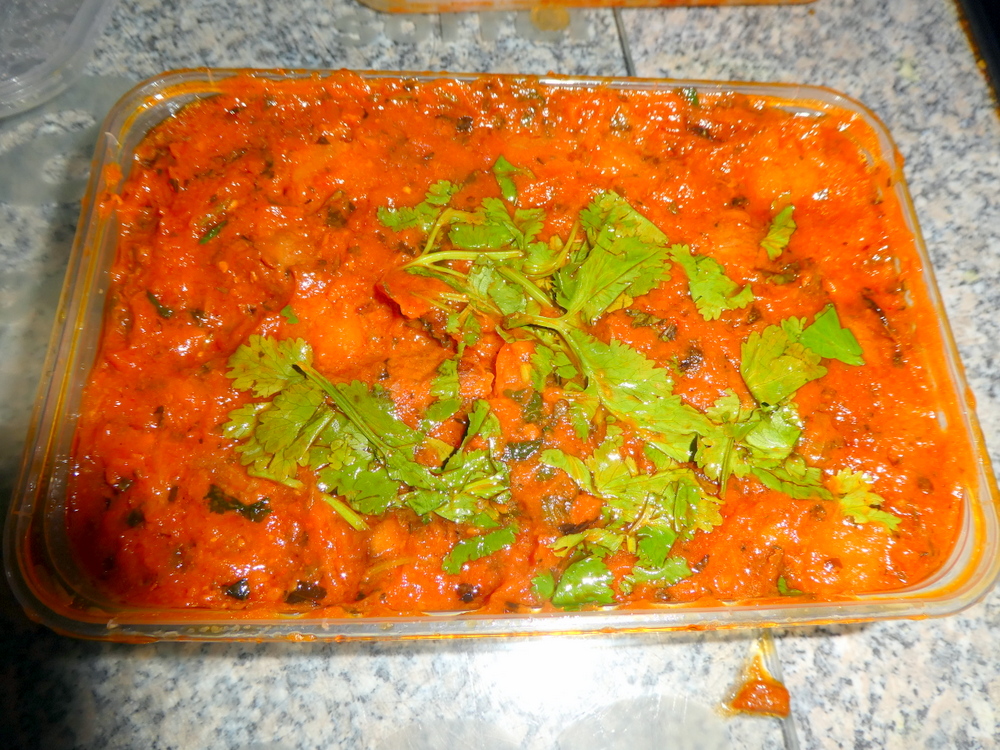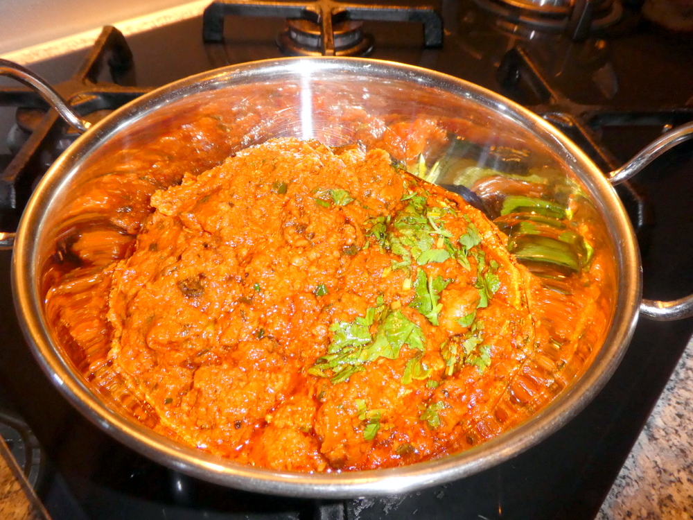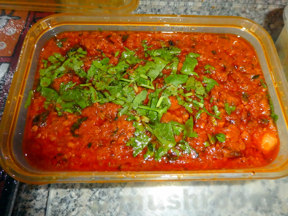 Marg had two karahi warming in the oven. The Curry was in plastic containers so the contents would be decanted for further heating. The Coriander Topping was minimal, what happened to the – spring onion – as the menu described?
