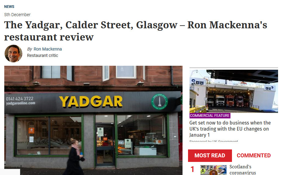 Another Saturday in Quasi-Lockdown, when Hector switched on the so far reliable Oppo, Howard had the honour of being the first to – ping – with the news that Yadgar Kebab House (148 Calder St, Govanhill, Glasgow, G42 7QP), Glasgow’s finest, had been reviewed in The Herald.