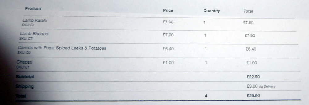 Having ticked the required boxes, I was was pleased that there was the capacity to make comments. Remember, this was my first time doing this in decades. I asked for the Karahi to be medium Spiced and the Bhoona to be above medium. Here also was the opperchancity to invoke the important clause – No Capsicum!