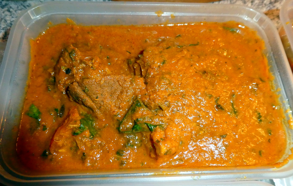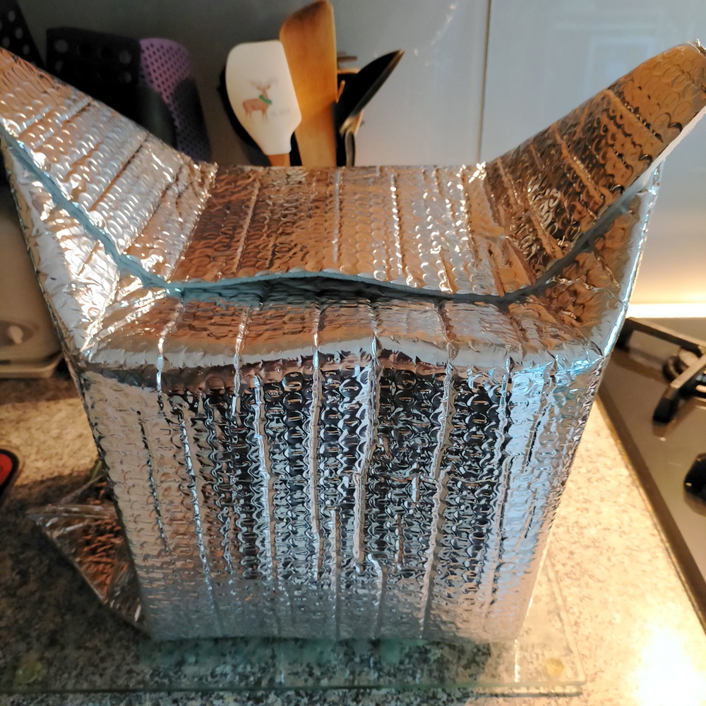 The food arrived at 13.30, well before the 15.30 deadline. Indeed, there were a few updates informing me that my Order was out for delivery, most efficient. I had expected a poly bag, not the sealed box. On opening the box, here was a thermal lining and a block of ice. The food was cold, reheating instructions were provided., these I would ignore.