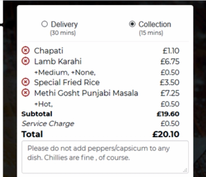No Mince today, Marg opted for Lamb Karahi (£6.75) with her usual Chapati (£1.10). The option was given to withhold the Green Peppers, the only Curry which mentioned them and made this offer. Someone knows. I also added my own caveat that no Peppers/Capsicum should appear in any Dish. The Order was placed at 17.30 and immediately acknowledged by email. Fifteen minutes was given as the preparation time. There was then a phone-call to verify that I did want – Lamb – in the Methi Gosht.
