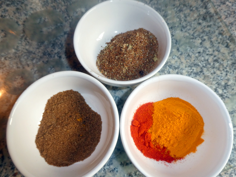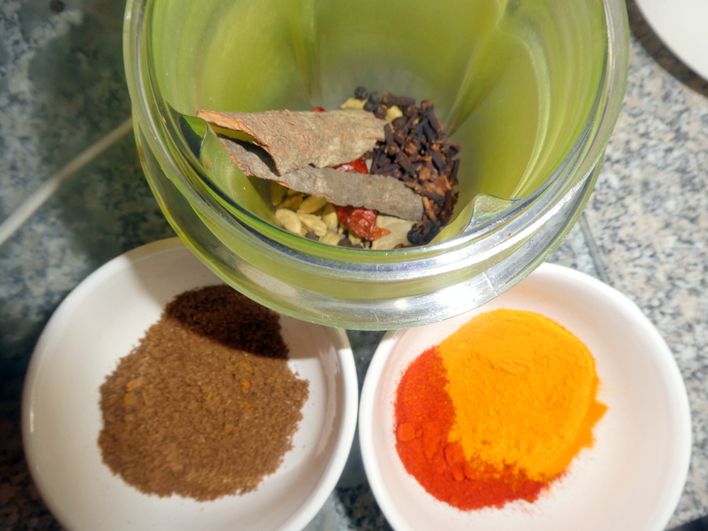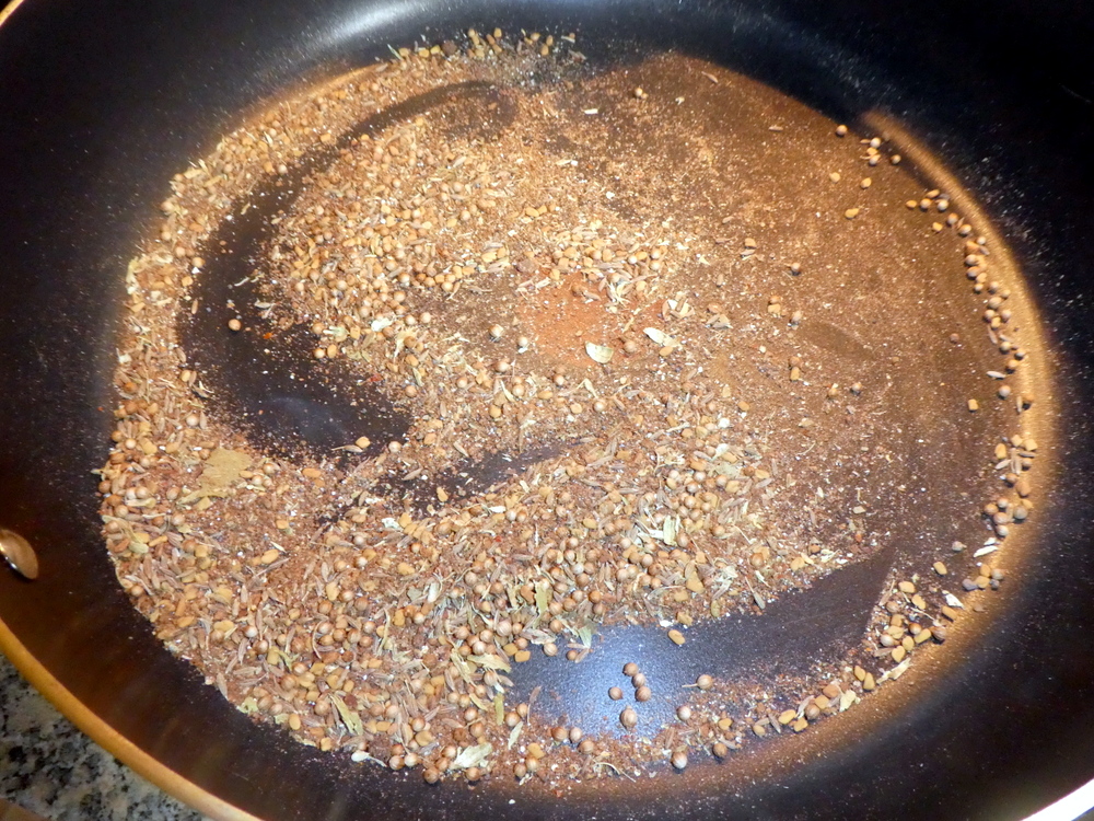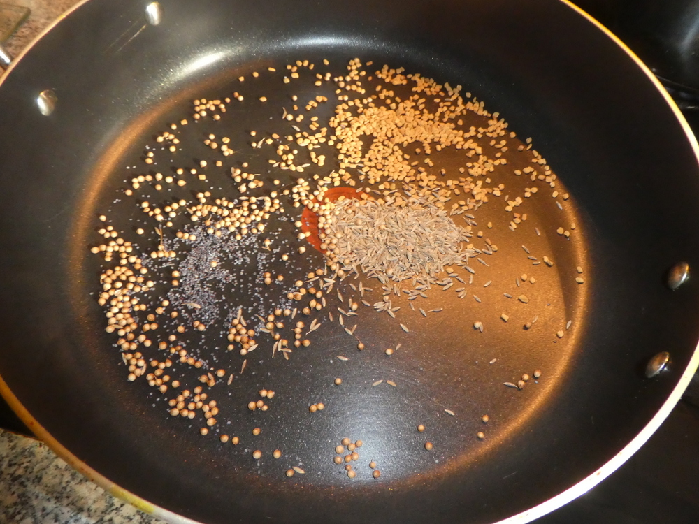 The fine Spices – Cumin Seeds, Coriander Seeds, Mustard Seeds – were dry fried along with my own freshly ground Garam Masala made today from Cinnamon Bark, Methi Seeds (Peter!), Cloves, Peppercorns, a dry Red Chilli, Bay Leaves, and Curry Leaves.