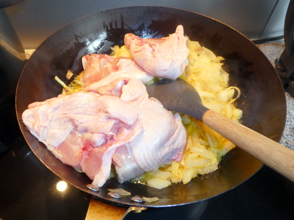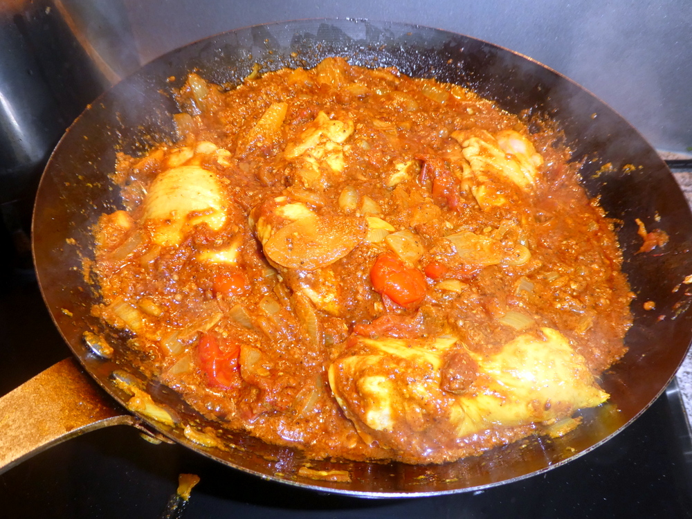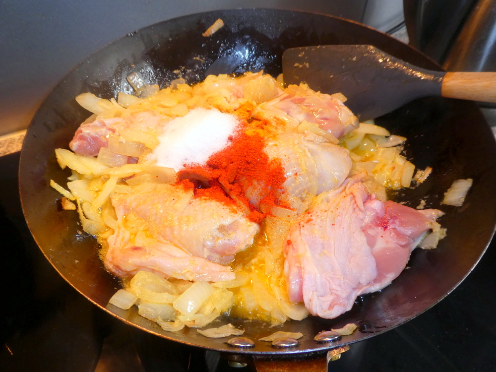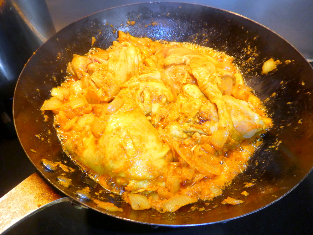 If I’m going to cook a Chicken Curry then it has to be with thighs, and on-the-bone. I stirred in the Meat in the hope that there would be some absorption of Flavours. Chicken, who was I kidding? The Salt went in along with the Turmeric and Paprika.