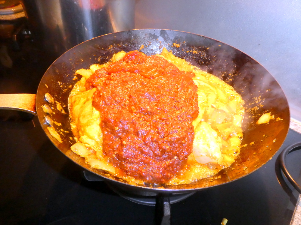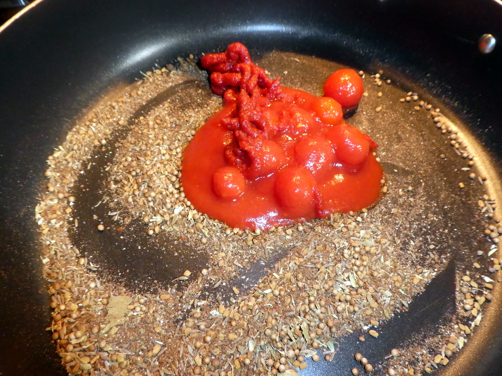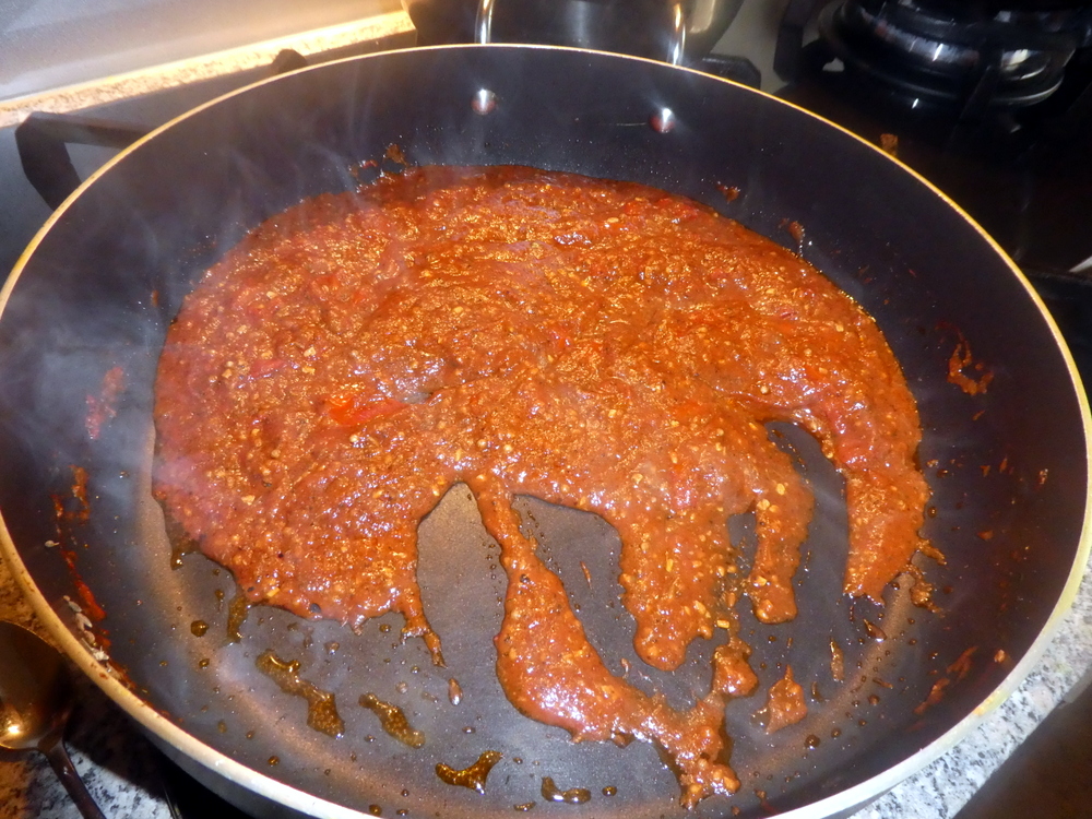 The aroma hit hard, and knowing how little the time there can be between success and clouds of black smoke, I started adding the tinned Tomatoes and Purée then Oil, to calm everything down.
