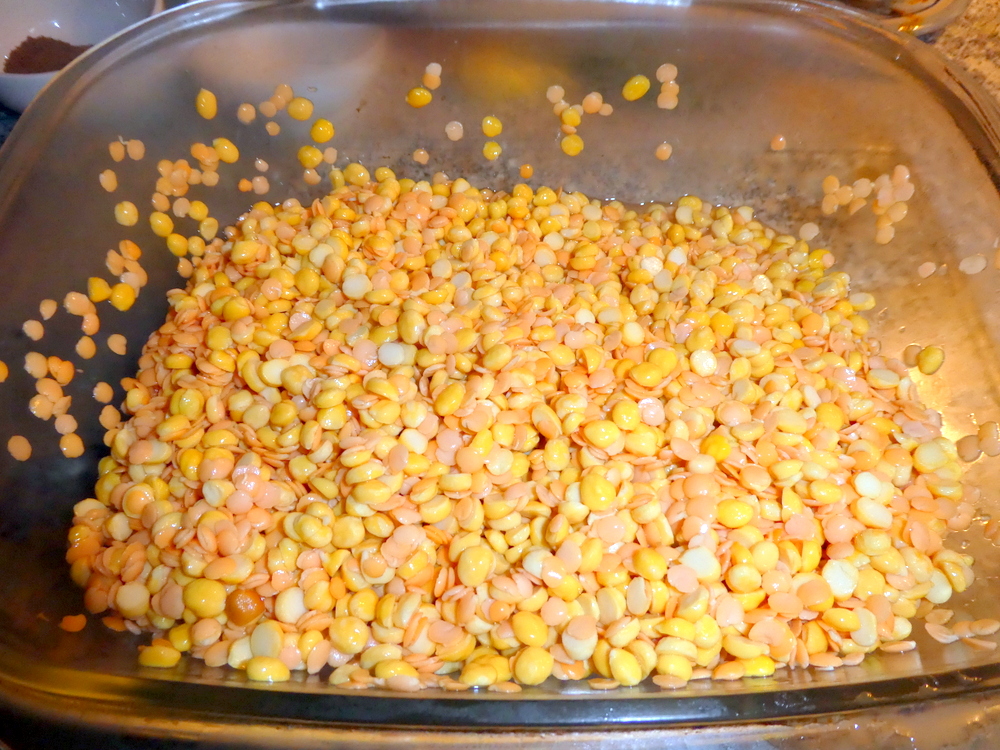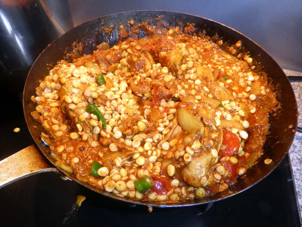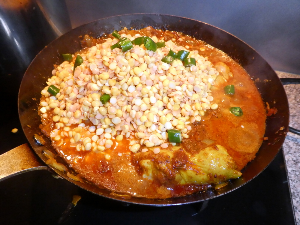 I had soaked a mass of Red Lentils and Split Chickpeas overnight in the hope the outcome would be less – crunchy – than for the Daal Gosht. The Chicken bones would end up as stock for Soup, hence the initial abundance of Lentils. When does a Split Chickpea become a Lentil? In mostly Pakistani restaurants – was the reply from my Guru – Bill.