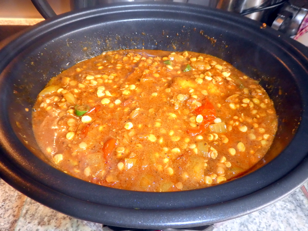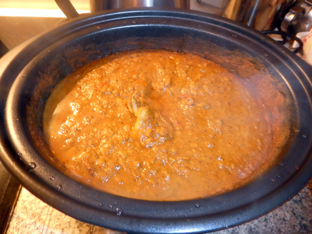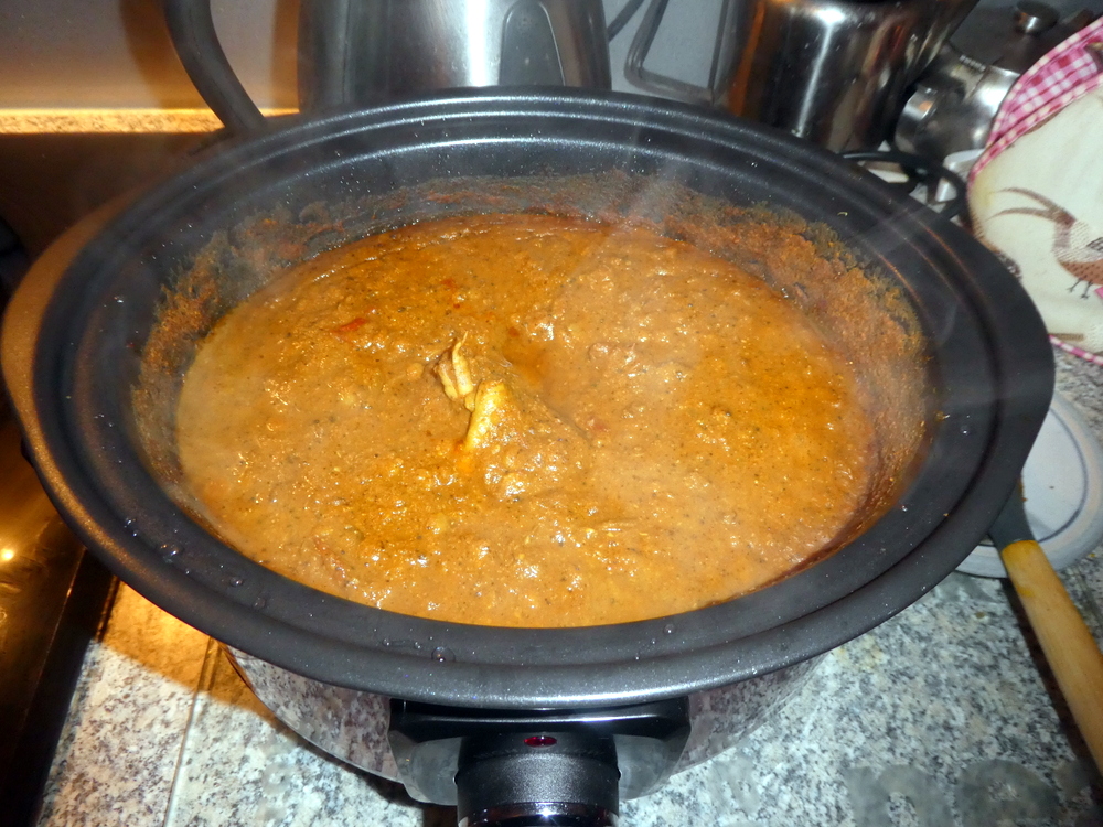 The slow cooker was once again employed, water was added else everything would have been way too dry. Five hours later, and time passes so quickly during Lockdown, I scooped out most of the Masala and blended it before returning it to the pot.