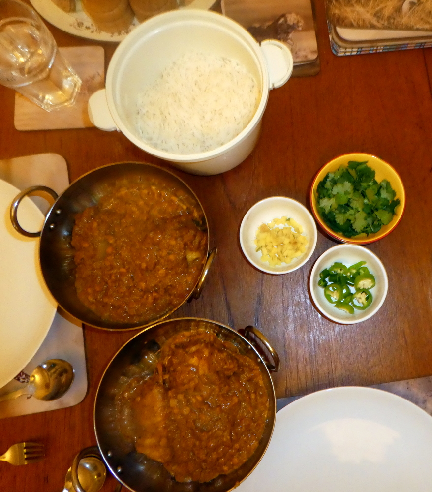 The Curry would be topped with the full – foliage – flavour triumvirate. During cooking, I had held back on the Green Chillies and Chilli Powder. A – kick – was required, for Hector at least. I bought a new 10kg bag of Basmati today. Rice has more then doubled in price during the years of Curry-Heute, with the exception of – easy cook – American Rice, no thanks.