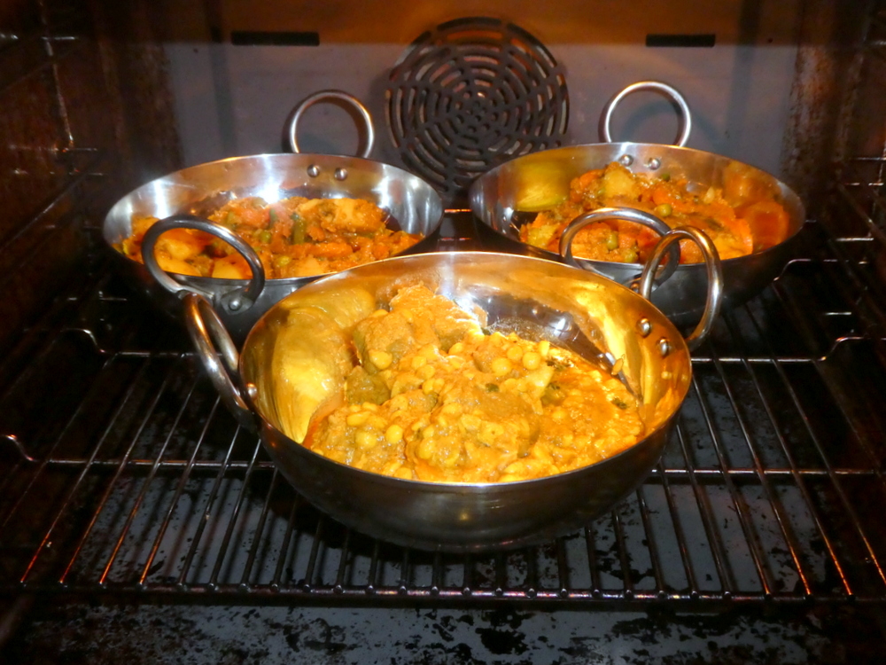 The three karahi were placed in the oven for twenty minutes, sufficient to reheat properly, and no burning was evident.