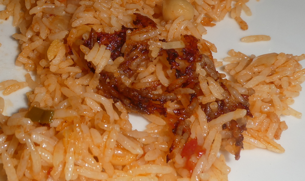 Marg tore in. Anytime I make Paella, this is what Marg seeks, her favourite part of the Rice, apparently.