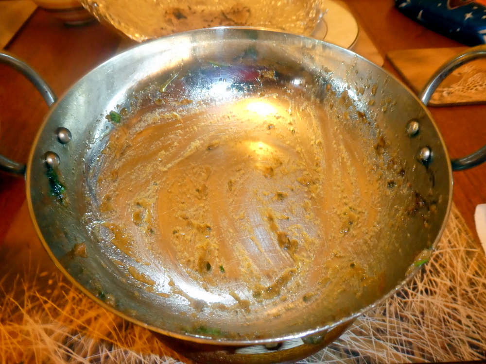 One of the main features of Curry served at Karahi Palace is that it is always served piping hot. Decanted to karahi, a full twenty minute reheat was applied in the oven. The Chapattis went in, still in the foil, for the last five. With a sufficiency of Ginger Strips already in place, the – foliage – today was restricted to Coriander.