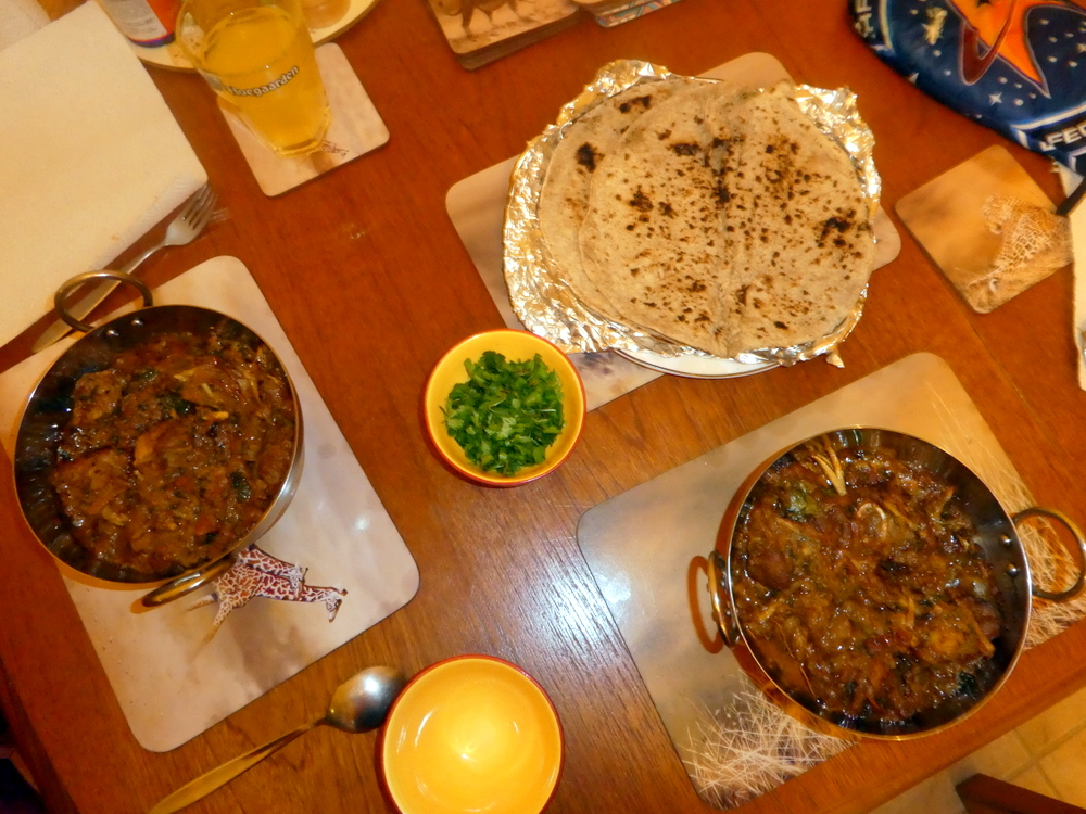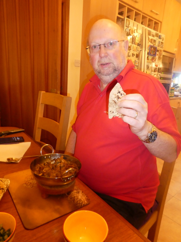 with more Curry than she would manage. Marg set aside that which she knew would not be managed for later. I ate on, savouring every mouthful of this joyous creation. The Spice was there, the Seasoning and the Methi. The Masala was scooped on to pieces of Chapatti. The Chapattis were a cut above those had of late, had I been dining in, a second would have been ordered. Hector becoming excited about a Chapatti? We live in strange times.
