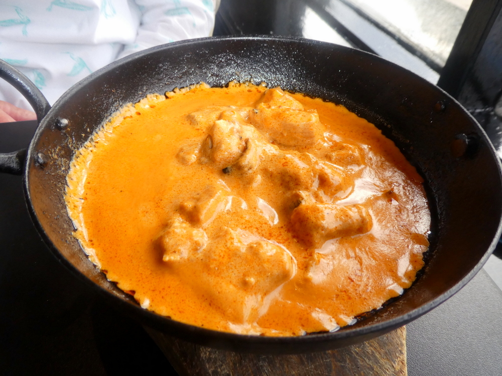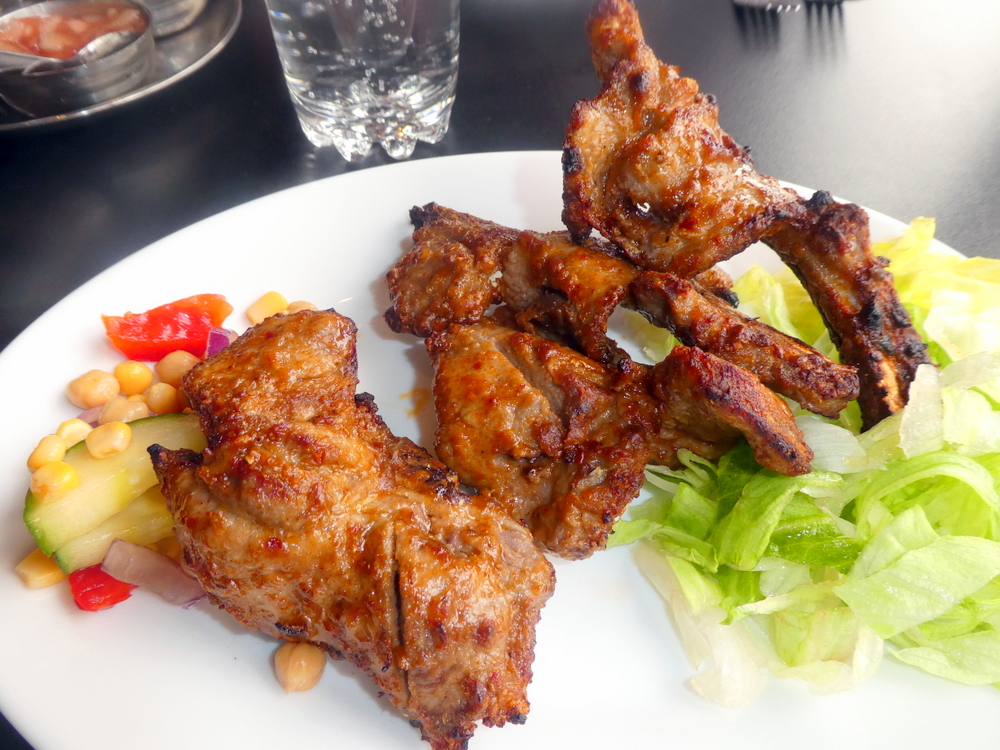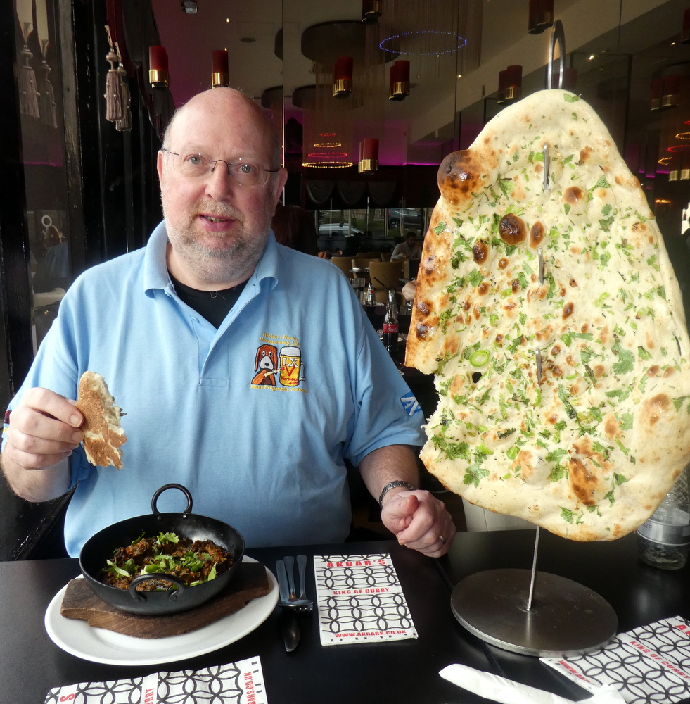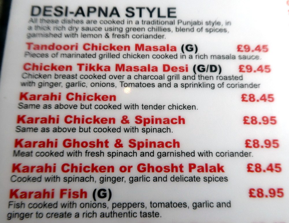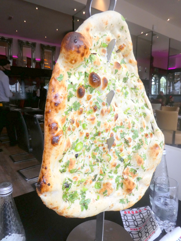 Marg declared Butter Chicken (£9.45) as her choice for this evening. She accepted that Rice was likely to be the better accompaniment, Pilau Rice (£2.45). Lamb Chops are still £4.45? The portion of four would surely be reduced? On the last visit, John ordered Karahi Gosht & Spinach (£8.95), this proved to be the – driest – of the three – Desi-style – Dishes served that night. The equivalent at Ambala truly hit the spot on Monday, the guarantee of Herbs, it had to be. Akbar’s is one of the too few venues which actually has Coriander & Chilli Naan (£2.95) on their menu. Knowing the size and the presentation, there would be enough to share.