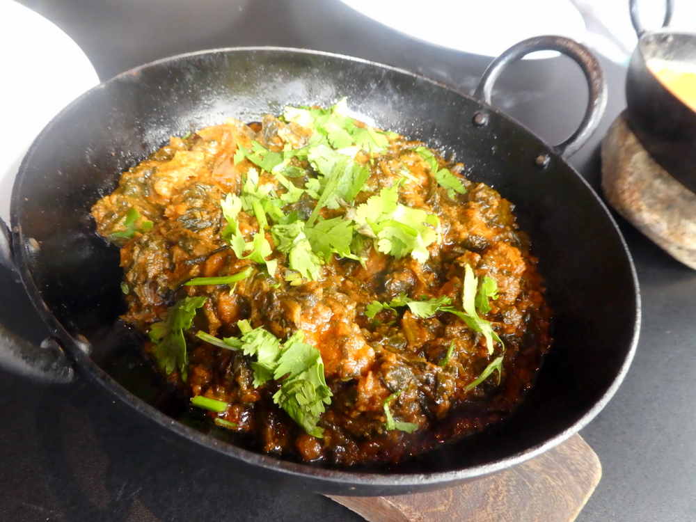 Coriander topped the melange of small-cut Meat and a suitably Thick Masala. This must have been darkest Curry I have seen in many moons. There was a sufficiency of Spinach, enough to make its presence known, not an excess.