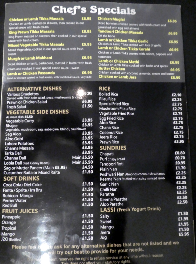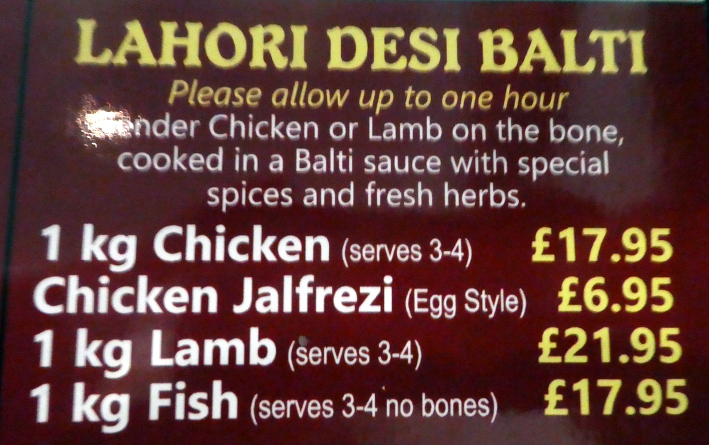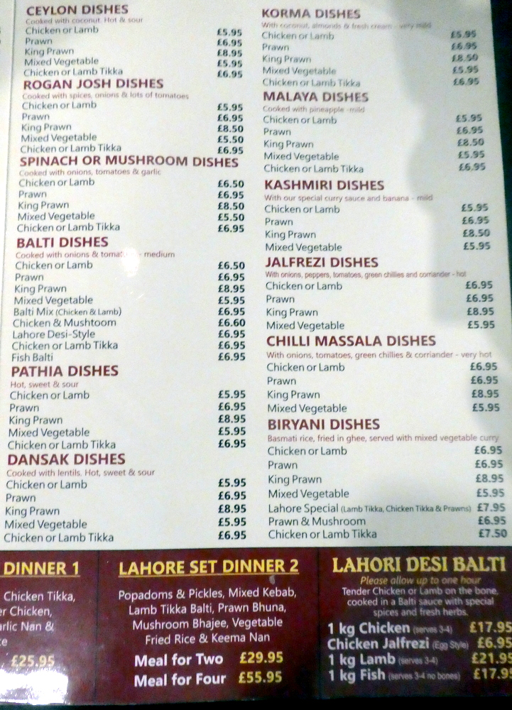 Given that an hour’s notice is required for the kilo of Lahori Desi Balti (£21.95) to be prepared, this was phoned in ahead of our intended 19.00 arrival. That we would be three diners only made the chap on the phone take note, especially when I said my wife would be ordering something from the Menu on our arrival. As the Desi Balti would be served on-the-bone, the kilo should not be onerous for Clive and Hector.