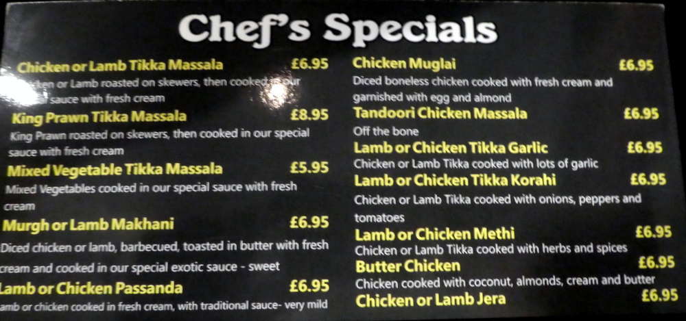 Marg was attracted by the Murgh Makhani £6.95), she thought it sounded exotic. When Hector sees – Makhani – the thought of the complex Daal comes to mind. Alas, Murgh Makhani is Butter Chicken in normal parlance. Butter Chicken (£6.95) was also in the Chef’s Specials, it had Almonds and Coconut, the Makhani clearly focuses on the Butter.
