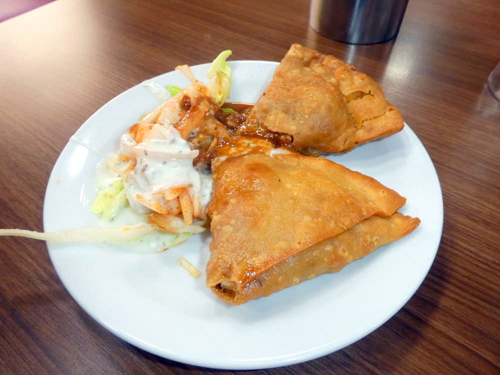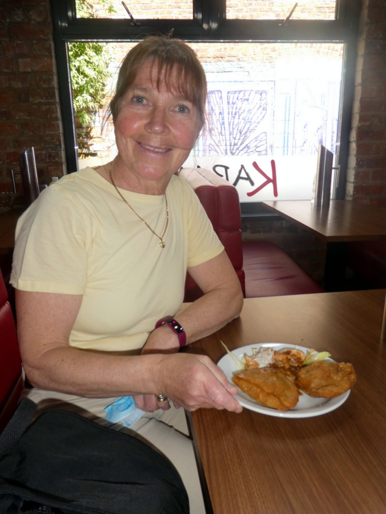 I took a table in the relatively empty restaurant. At this time on a weekday, the place would be heaving. Squeezing into a seat here is difficult at the best of times, a year of Lockdown has not helped the waistline. Marg arrived in time to take a photo, her chosen venue would take her in, but not serve her for over half an hour. Marg fetched a pair of Samosas.