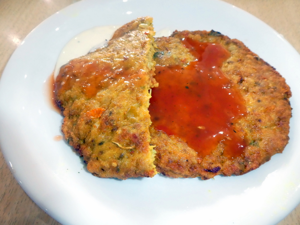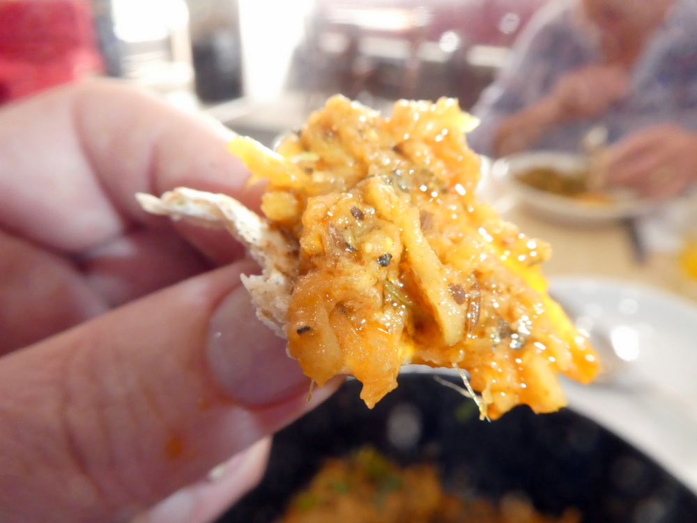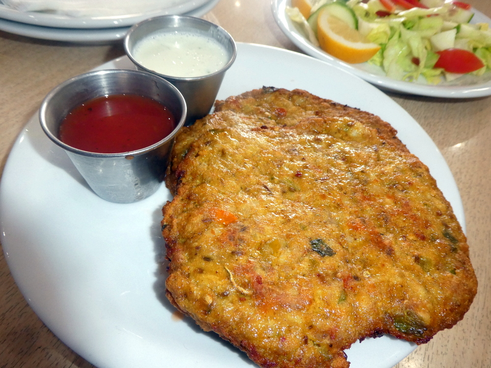 Look at the size of these, two huge Chicken Chapli. Marg decided to help me out and have one half, along with the bulk of the Salad. The Red Sauce served hot is an ideal accompaniment, extra heat in both senses.